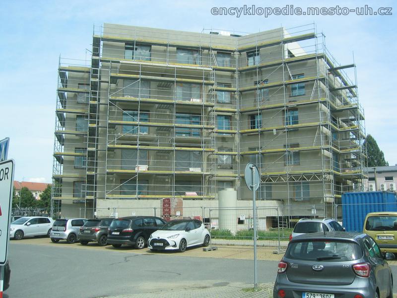 Šestipodlažní atypický dům s podzemními garážemi byl postaven v letech 2023-2025 v prázdném prostoru bývalých kasáren.-